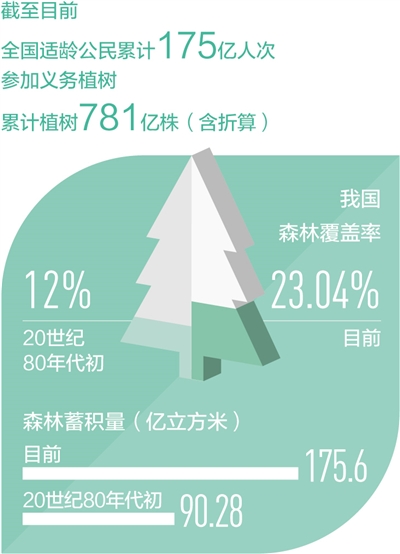 今年是全民义务植树开展40周年,截至目前,全国适龄公民累计175亿人次参加义务植树,累计植树781亿株(含折算)。