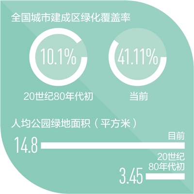 良好生态环境是最普惠的民生福祉,共建才能共享。近年来,各地、各部门和有关系统广泛组织动员城乡居民义务植树,积极推行“身边增绿”,开展植树栽花种草,单位庭院、街道社区、厂区营区、乡镇村屯绿化美化日新月异。全国城市建成区绿化覆盖率由20世纪80年代初的10.1%提高到现在的41.11%,人均公园绿地面积由3.45平方米提高到14.8平方米,城乡人居环境持续改善。